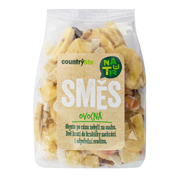 Směs sušeného a proslazeného ovoce obsahuje ananas a papayu, medové banánové chipsy, nepražené kokosové chipsy a rozinky.