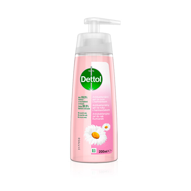 Výrobce: Dettol Dettol antibakteriální gel na ruce s heřmánkem. Ničí 99,9 % bakterií a virů bez použití vody s biocidním účinkem po 60 sekundách. Nelepkavé složení bez nutnosti oplachování.