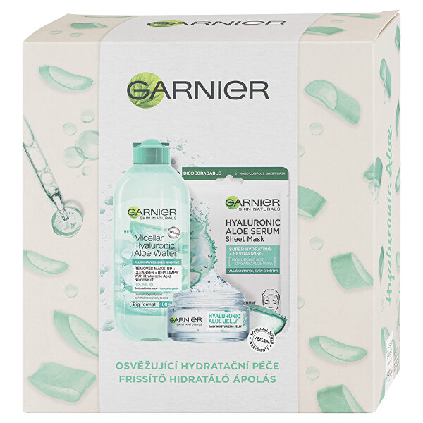 Výrobce: Garnier Dárková sada Garnier Hyaluronic Aloe dodá pleti potřebnou dávku hydratace, výživy a osvěžení. Balení obsahuje micelární vodu Hyaluronic Aloe, denní krém v gelové textuře a textilní masku. Micelární voda Hyaluronic Aloe představuj