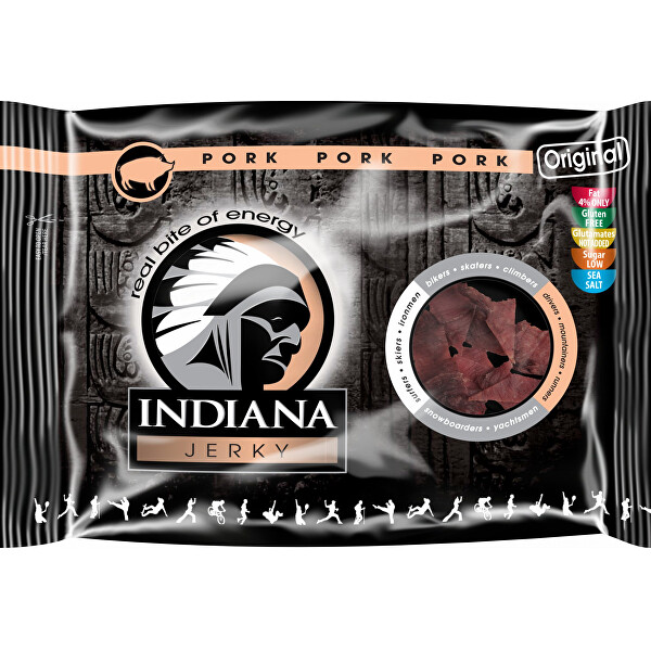 Výrobce: Indiana Indiana Jerky pork (vepřové) Original je pochoutka z vepřového sušeného masa. Originální receptura s nezaměnitelnou evropskou slanou příchutí masa. Každé balení obsahuje absorbér kyslíku, který zachovává chuť a aroma bez jakékol