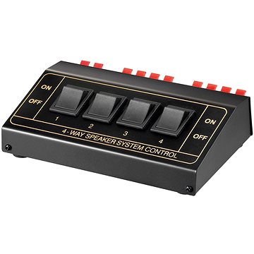Přepínač OEM Přepínač reproduktorů 4:1, stereo, manuální: Přepínač OEM reproduktorů 4:1 je určen pro připojení 4 sad reproduktorů k jednomu zdroji. Přepínání probíhá mechanickým přepínačem pro každý výstup (4