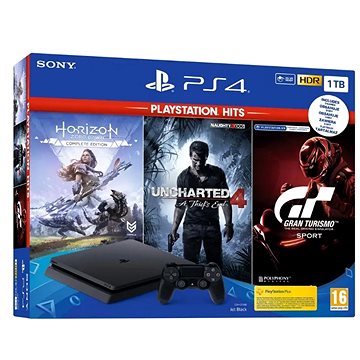 Výrobce: SONY Herní konzole PlayStation 4 Slim 1TB + 3 hry (GT Sport, Uncharted 4, Horizon Zero Dawn):Se Sony Playstation 4 si díky přiloženému headsetu užijete hry ve virtuální realitě. Konzole nabízí výkonný procesor a v balení najdete i DualShock