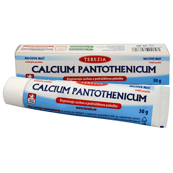 Výrobce: Terezia Company Mast CALCIUM PANTOTHENICUM se používá ke zklidnění a regeneraci podráždené kůže po nadměrném slunění, na suchou a drsnou pokožku. Mast CALCIUM PANTOTHENICUM je také vhodná pro ošetření pokožky prsních bradavek kojících žen a