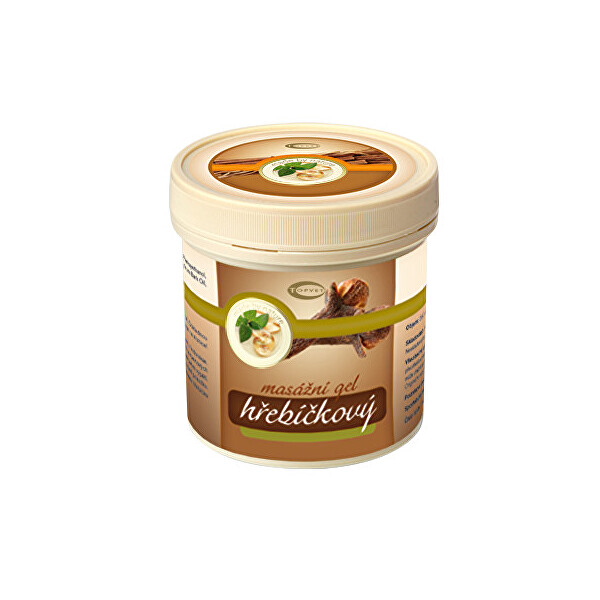 Výrobce: Topvet Hřebíčkový masážní gel prohřívá a čistí pokožku, uvolňuje horní cesty dýchací. Hřebíčkový olej je získáván z poupat hřebíčkovce, stromu původem z Indonésie. Hřebíček je bohatý na Eugenol (85 – 95 %) a řadu dalš