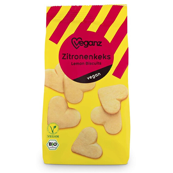 Výrobce: Veganz Citrónové sušenky ve tvaru srdíček chutnají čerstvě a svěže. Pouze přírodní přísady dělají z těchto citrónových sušenek perfektní sladkou svačinku. PŠENIČNÁ MOUKA*, třtinový cukr*, slunečnicový olej*, citrónový olej (