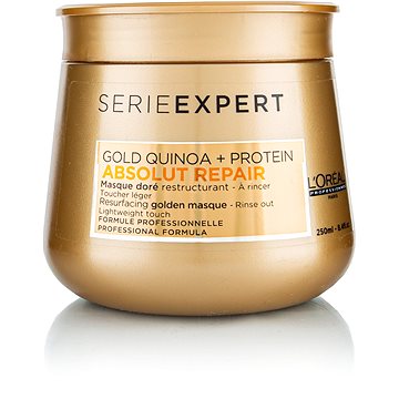 Oplachová maska ĽORÉAL PROFESSIONNEL zanechá vlasy až 7× lesklejší a dokonale vyhlazené. Klíčové vlastnosti masky na vlasy ĽORÉAL PROFESSIONNEL Serie Expert Absolut Repair Golden Mask 250 mlMaska ĽORÉAL PROFESSIONNEL Serie Expert Absolut Repair Golden je určena pro silně poškozené vlasyRegeneruje vlasy zničené častým barvením a tepelnými úpravamiPosiluje vlasovou strukturu a zabraňuje lámání konečků až o 77 %Složení krémové konzistence s obsahem zlaté quinoy a proteinůProniká hluboko do vlasu a obnovuje jeho poškozené částiOplachová maska ĽORÉAL PROFESSIONNEL pro 7× lesklejší a dokonale vyhlazené vlasyPoužití:Masku vetřete do umytých vlasů, nechte několik minut působit a poté důkladně opláchněte.Složení:Aqua / Water, Cetearyl Alcohol, Behentrimonium Chloride, Candelilla Cera / Candelilla Wax, Amodimethicone, Cetyl Esters, Isopropyl Alcohol, Glycerin Phenoxyethanol, Trideceth-6, Linalool, Lactic Acid, Hexyl Cinnamal, Chlorhexidine Digluconate, Cetrimonium Chloride, Limonene, Sodium Hydroxide, Chenopodium Quinoa Seed Extract, Hydroxypropyltrimonium Hydrolyzed Wheat Protein, Ci 19140 / Yellow 5, Ci 15985 / Yellow 6, Parfum / Fragrance.