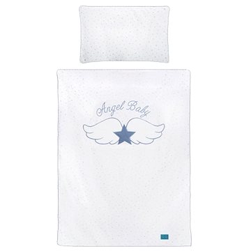 Povlečení zdobí křidélka a modrý nápis Angel Baby. 5dílná souprava je tvořena povlečením na polštářek, na peřinku, mantinelem, polštářkem a peřinkou.