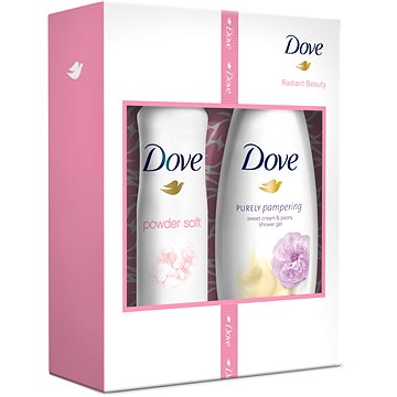 Díky technologii NutriumMoisture bude po jeho použití pokožka vyživená, hydratovaná a sametově hebká. Klíčové vlastnosti dárkové sady DOVE Radiant Beautydárková sada je určena pro všechny ženyDOVE Radiant Beauty obsahuje antiperspirant ve spreji a sprchový gelsprchový gel zanechá pokožku jemnou a hydratovanouantiperspirant bez obsahu alkoholu chrání proti pocení po dobu 48 hodinvůně sprchového gelu po pivoňkách a antiperspirant s vůní dětského pudru SloženíDove deo spray Powder Soft:Butane, Isobutane, Propane, Aluminum Chlorohydrate, PPG-14 Butyl Ether, Cyclopentasiloxane, Parfum, Disteardimonium Hectorite, Helianthus Annuus Seed Oil, C12-15 Alkyl Benzoate, Octyldodecanol, BHT, Dimethiconol, Propylene Carbonate, Tocopheryl Acetate, Alpha-Isomethyl Ionone, Benzyl alcohol, Benzyl Salicylate, Citronellol, Coumarin, Geraniol, Limonene, LinaloolDove sprchový gel smetana s pivoňkou:Aqua, Cocamidopropyl Betaine, Sodium Hydroxypropyl Starch Phosphate, Lauric Acid, Hydrogenated Soybean Oil, Sodium Lauroyl Glycinate, Sodium Lauroyl Isethionate, Glycerin, Sodium chloride, Parfum, BHT, Butylene Glycol, Citric acid, DMDM Hydantoin, Guar Hydroxypropyltrimonium Chloride, Helianthus Annuus Seed Oil, Iodopropynyl Butylcarbamate, Paeonia Officinalis Flower Extract, Sodium benzoate, Sodium hydroxide, Sodium Isethionate, Stearic Acid, Tetrasodium EDTA, Zinc Oxide, Benzyl alcohol, Butylphenyl Methylpropional, Citronellol, Coumarin, Geraniol, Limonene, Linalool, CI 17200, CI 42090Obsah balení:Dove deo spray Powder Soft 150 ml Dove sprchový gel smetana s pivoňkou 250 ml