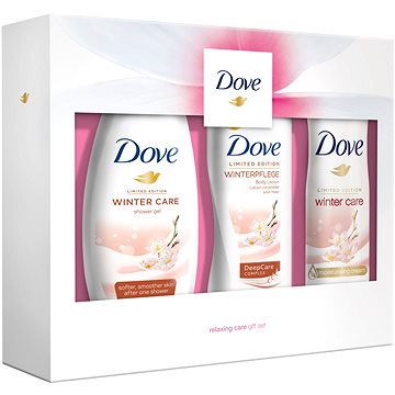 Dárková kosmetická sada DOVE Winter Care Gift Set: Pěkná dárková sada pro ženy s tělovou kosmetikou značky DOVE obsahuje limitovanou edici přípravků řady Winter Care - vyživující sprchový gel 250 ml, regenerační tělové mléko 250 ml a pečující antiperspirant ve spreji 150 ml.