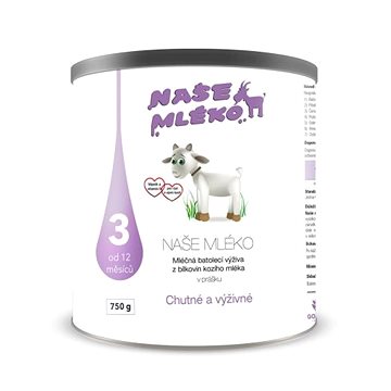 Díky svému složení a vlastnostem charakteristickým pro kozí mléko je Naše mléko 3 velmi dobře stravitelné a je plnohodnotnou a zdravou hlavní složkou jídelníčku kojenců a malých dětí.            Klíčové vlastnosti kojeneckého mléka Naše mléko 3Pokračovací mléčná výživa z vysoce kvalitního kozího mlékaAlternativa nejen pro alergiky k běžně dostupné výživě z kravského mlékaVhodné pro děti od 12 měsíců do tří letChutné a lehce stravitelné mlékoObsahuje všechny nezbytné vitamíny, minerály a další složky pro správný vývoj vašeho miminkaSložení:syrovátkové proteiny kozího mléka maltodextrin, laktóza, plnotučné kozí mléko, rostlinné oleje (řepkový olej, slunečnicový olej), přírodní aroma, fruktooligosacharidy, mléčnan vápenatý, emulgátor: řepkový lecitin, omega-3 a omega-6 mastné kyseliny, hydrogenuhličitan sodný, kyselina L-askorbová, nikotinamid, DL-alfa tokoferylacetát, D-pantothenát vápenatý, riboflavin, pyridoxin hydrochlorid, thiamin mononitrát, kyselina listová, D-biotin, kyanokobalamin, taurin, cholin, mléčnan železnatý, nukleotidy (cytidin 5´-monofosforečnan, uridin 5´-monofosforečnan, adenosin 5´-monofosforečnan, inosin 5´-monofosforečnan, guanosin 5´-monofosforečnan), mléčnan zinečnatý, cholekalciferol, síran měďnatý, retinylpalmitát, seleničitan sodný.